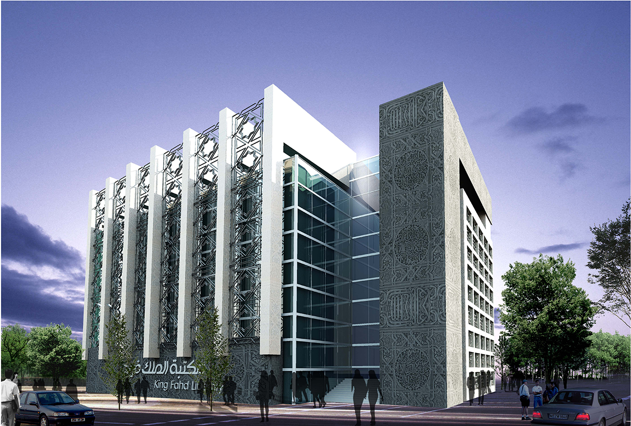 The King Fahd Holy Quran Library / Print House is one of the most important projects that will be built in Madinah Munawarah. The library is dedicated completely to printing of the Holy Quran. Its estimated space is 3200 square meters and it includes six ground floors, four double floors and two basement floors. The library includes also a center for visual and audio tools, a lectures room, a museum, a reading area in addition to office spaces and service facilities. The designer has described his project as a solid steel part dominated by Quran inscriptions, while the vitreous part represents the pages of a book.